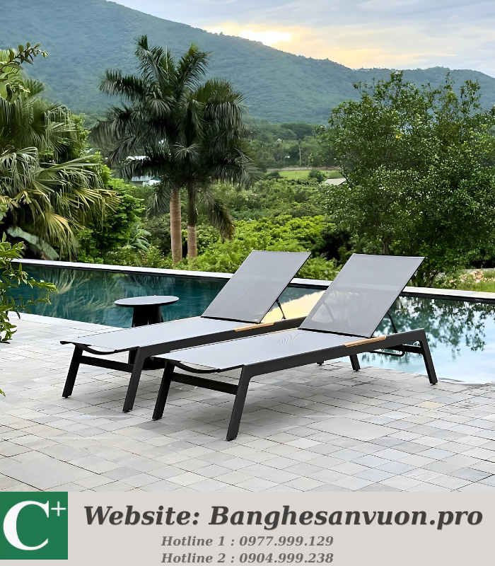 - Chất liệu: Khung nhôm sơn tĩnh điện, mặt nằm và lưng tựa lưới Textilene kháng nước
